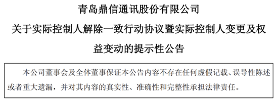 2025年11月14日,鼎信通讯发布公告称,为持续优化公司治理结构、提升决策效率,公司控股股东、实控人曾繁忆和王建华宣告解除《一致行动协议》。