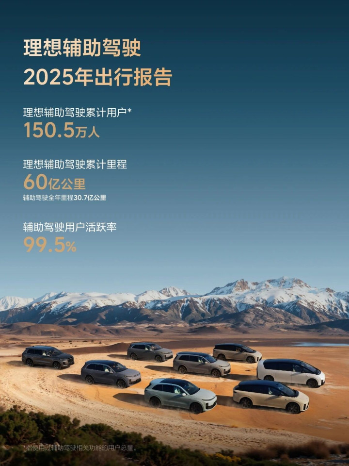 IT之家1月18日消息,理想汽车官方今日发布了“理想辅助驾驶2025年出行报告”。据介绍,理想辅助驾驶累计用户150.5万人、理想辅助驾驶累计里程60亿公里(辅助驾驶全年里程30.7亿公里)、辅助驾驶用户活跃率99.5%。