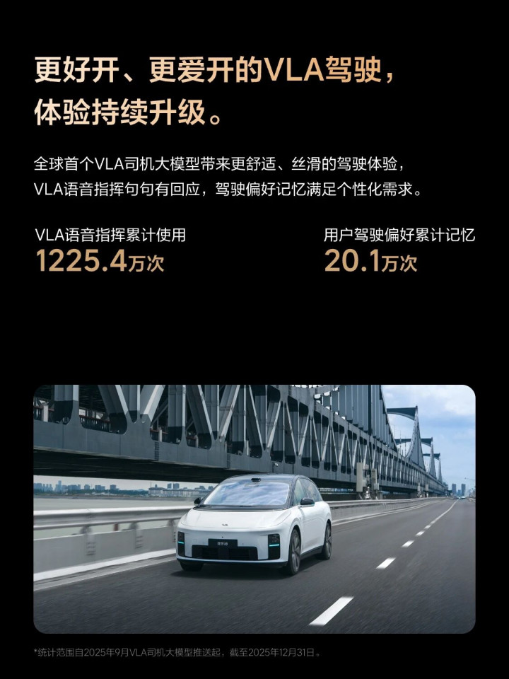 理想汽车2025年度单日辅助驾驶里程超1000公里的次数有36643次,单个用户最长辅助驾驶里程11.9万公里;VLA语音指挥累计使用1225.4万次,用户驾驶偏好累计记忆20.1万次。