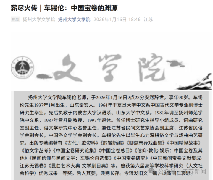 据扬州大学文学院消息,扬州大学文学院车锡伦老师,于2026年1月16日9点28分安然辞世,享年90岁。
