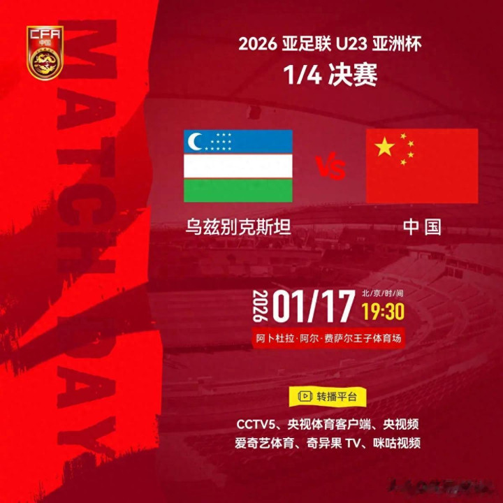 北京时间1月17日19:30,U23亚洲杯四分之一决赛的焦点战一触即发。历史性首次闯入淘汰赛的中国U23男足,将迎战实力雄厚、以C组头名晋级的乌兹别克斯坦U23。