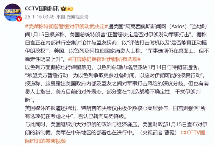 据美国“阿克西奥斯新闻网(Axios)”当地时间1月15日报道称,美国总统特朗普“正暂缓决定是否对伊朗发动军事打击”。据称白宫正在内部进行密集讨论并与盟友磋商,以“评估打击时机以及‘是否能真正动摇伊朗政权’”。美国、以色列及阿拉伯国家消息人士称,“军事选项仍在桌面上,但不确定性明显上升”。