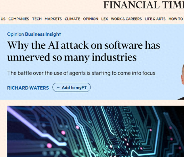 [行家网科技轮廓报说念]2月13日,据《金融时报》报说念,近日,东说念主工智能对软件行业的正面冲击激发华尔街及多个行业的高度病笃,金融、法律、媒体等以信息为中枢家具的规模尤为暴躁,Anthropic、OpenAI等AI企业的布局,更是让传统软件巨头的商所在位碰到前所未有的挑战。