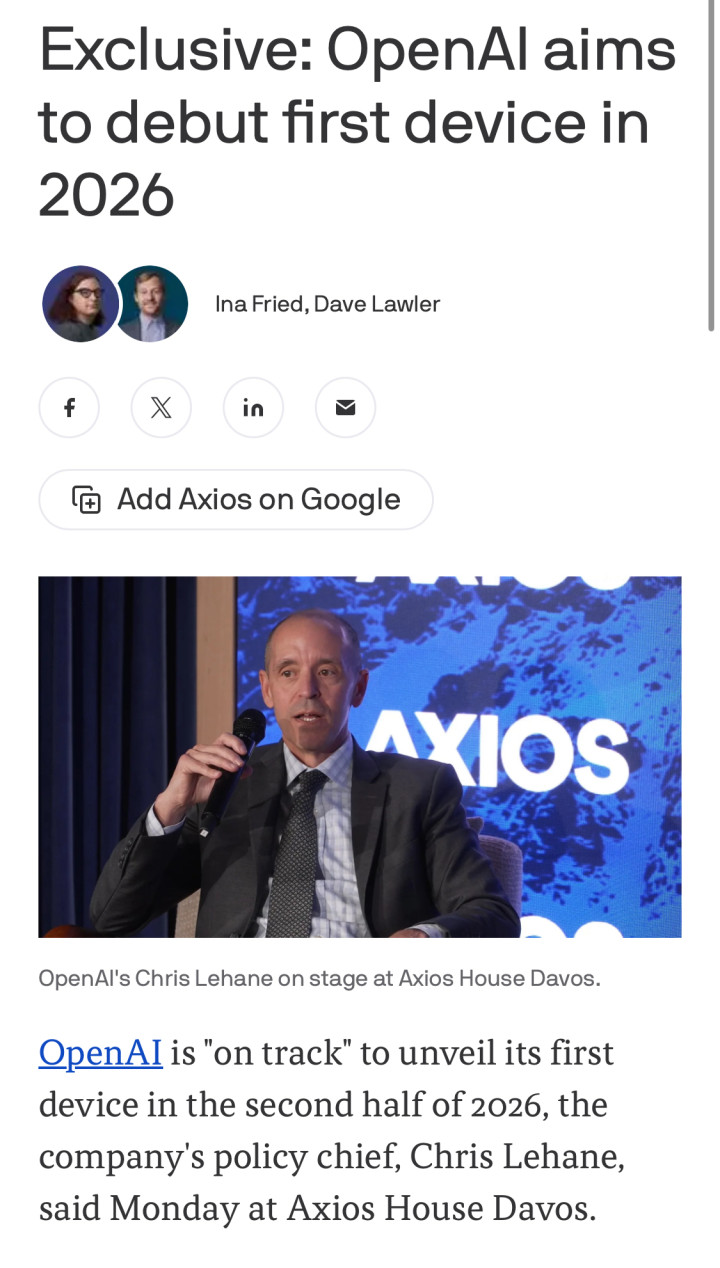 IT之家1月19日消息,据Axios网站报道,OpenAI政策主管克里斯·莱恩周一在达沃斯论坛透露,公司“正按计划”于2026年下半年推出其首款设备。