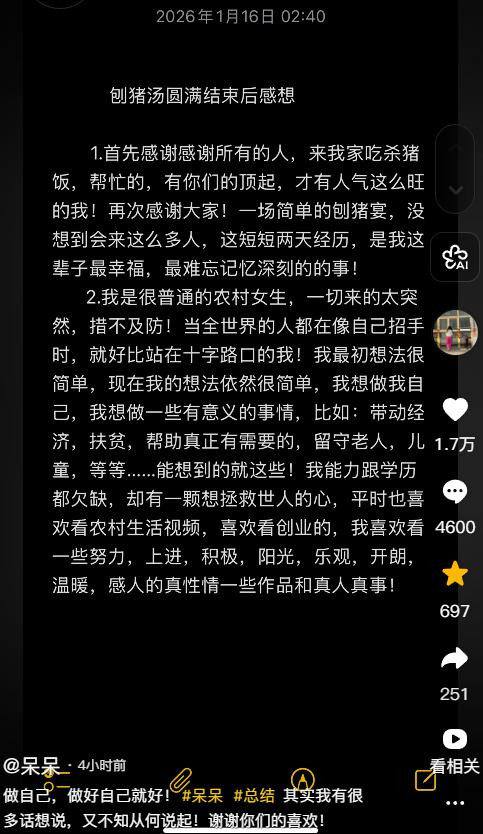 其一,呆呆感谢所有在后面顶起她闯的这场大“祸”的所有人,就是有众人的帮忙,杀猪宴才会如此成功。
