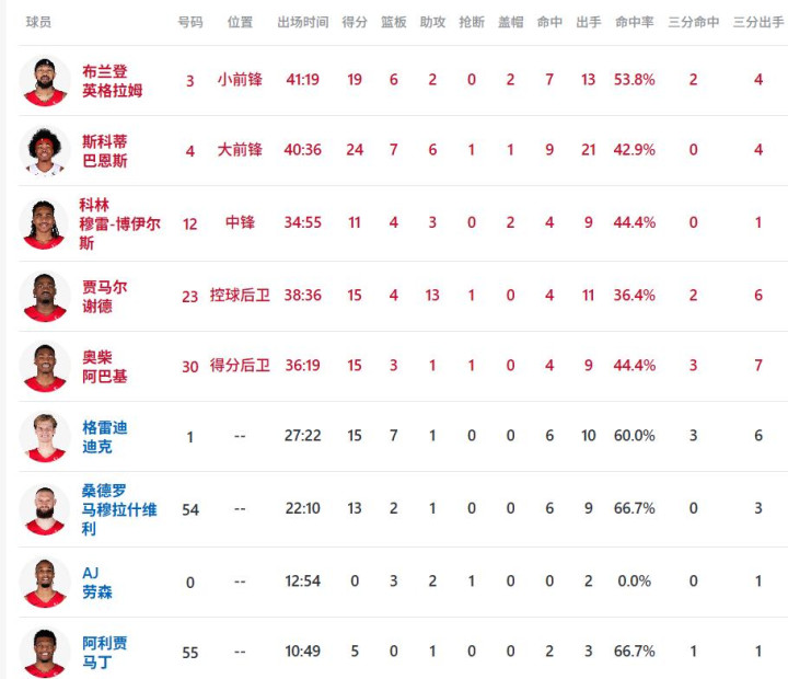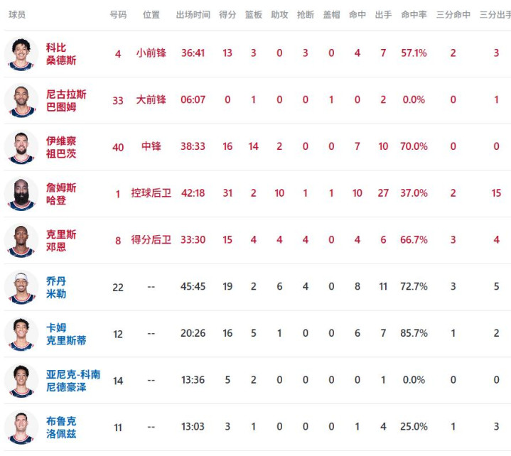加时赛中,哈登持续主宰赛场,凭借个人能力帮助快船始终压制对手,桑德斯关键时刻的罚球更是将分差扩大至4分。最终快船以121:117锁定胜局。数据方面,哈登贡献31分10助攻,成为球队取胜核心,巴恩斯也有24分7篮板的亮眼表现。