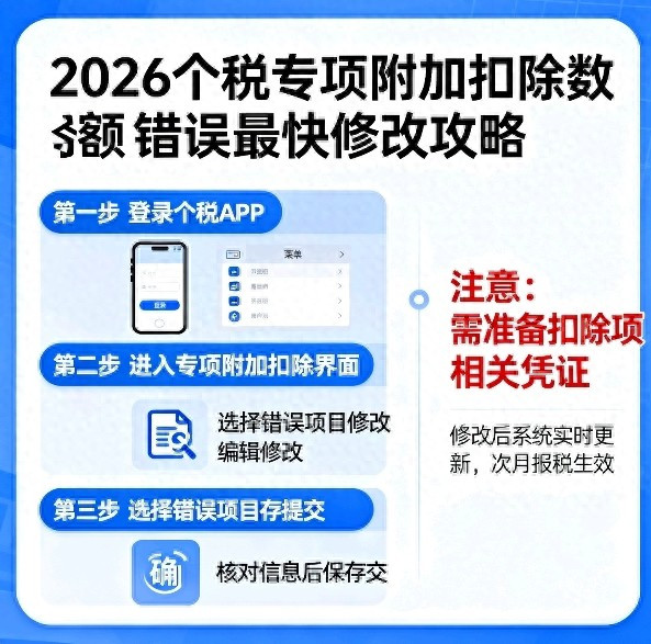 2026年个税专项附加扣除申报和核验已经全面展开,不少人在核对个税APP信息时,发现扣除数额和自己实际情况对不上,有的是扣除金额少了,有的是项目没生效,还有的是多人共享扣除额度算错了。其实这个问题不用慌,2026年税务系统优化了修改流程,线上就能快速更正,今天就把具体操作方法和注意事项讲透,保证一看就会。